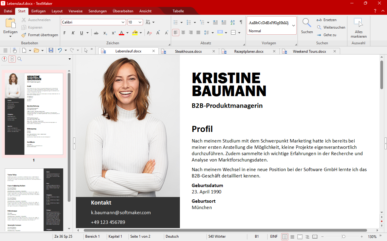 Mit TextMaker erstellen Sie im Handumdrehen Dokumente jedes Umfangs – ob Flyer, Broschüre, Geschäftsbrief oder komplette Studienarbeit. Durch die native Verwendung des Dateiformats DOCX sind Ihre Dokumente kompatibel zu Microsoft Word.